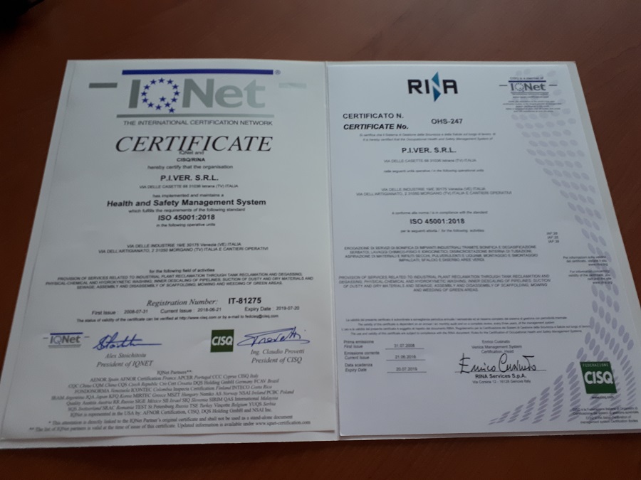 1° Azienda certificata con ISO 45001:2018 con Ente di certificazione RINA SpA in Italia.